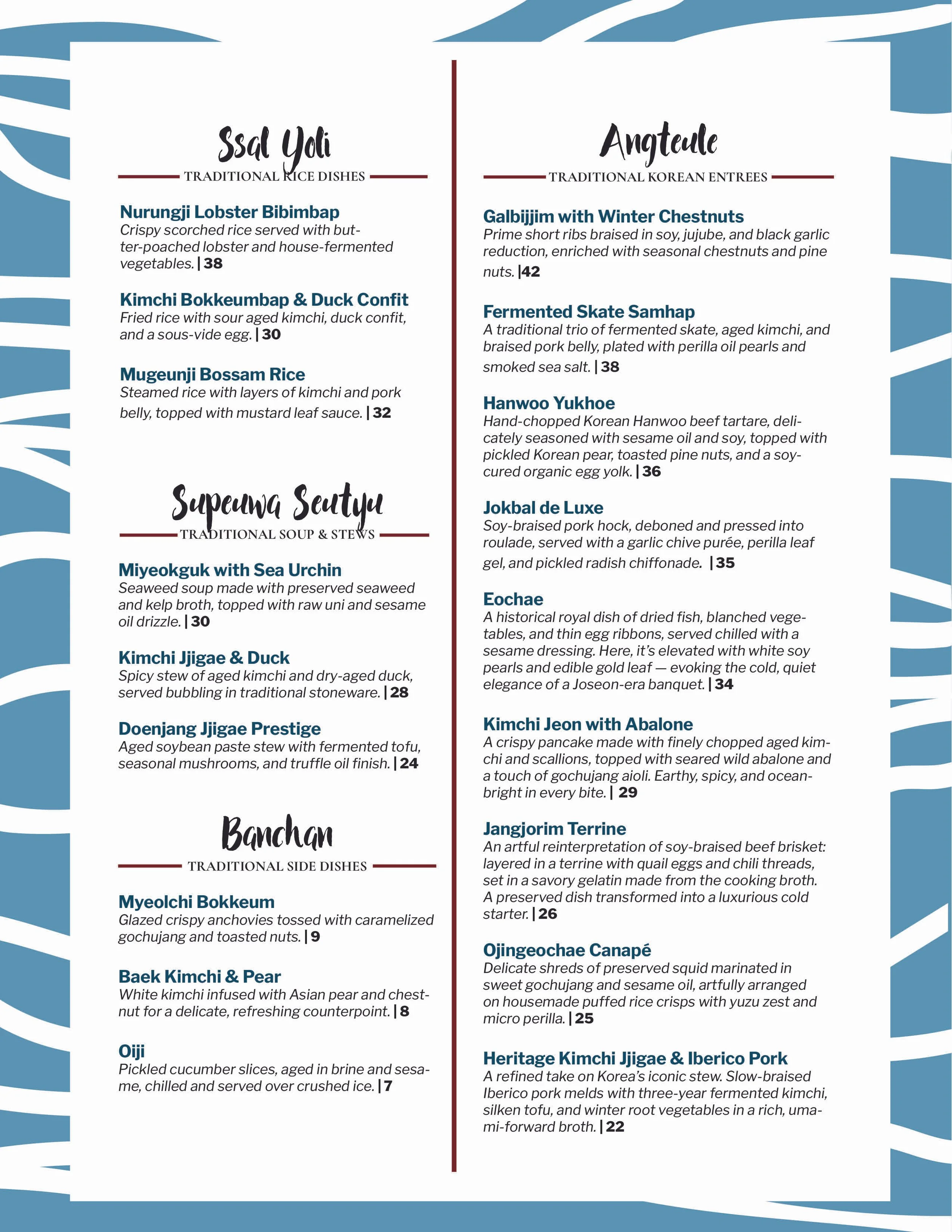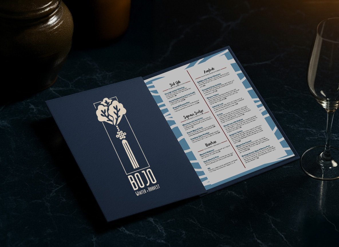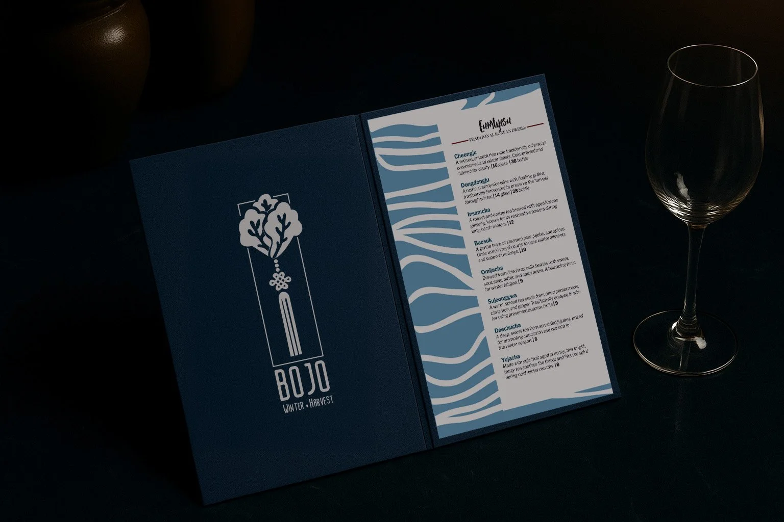 Located in Philadelphia, Bojo is a modern Korean restaurant inspired by the tradition of preserving food during the harsh winter months. Bojo's original concept was based on kimchi, which is reflected in the subtle drops of red throughout the restaurant and the varying shades of blue symbolizing Korea’s cold winters. The menu centers around fermented, pickled, and dried ingredients, reimagined through contemporary culinary techniques. The restaurant's name, meaning "to preserve," reflects its dedication to preserving both food and culture.