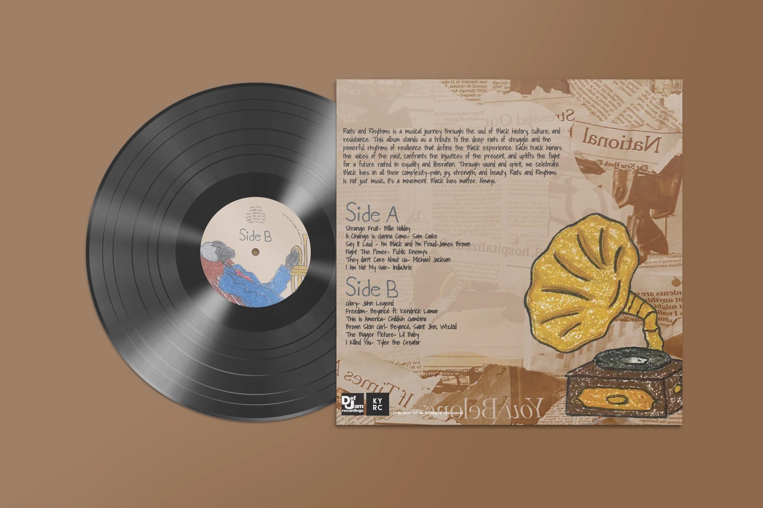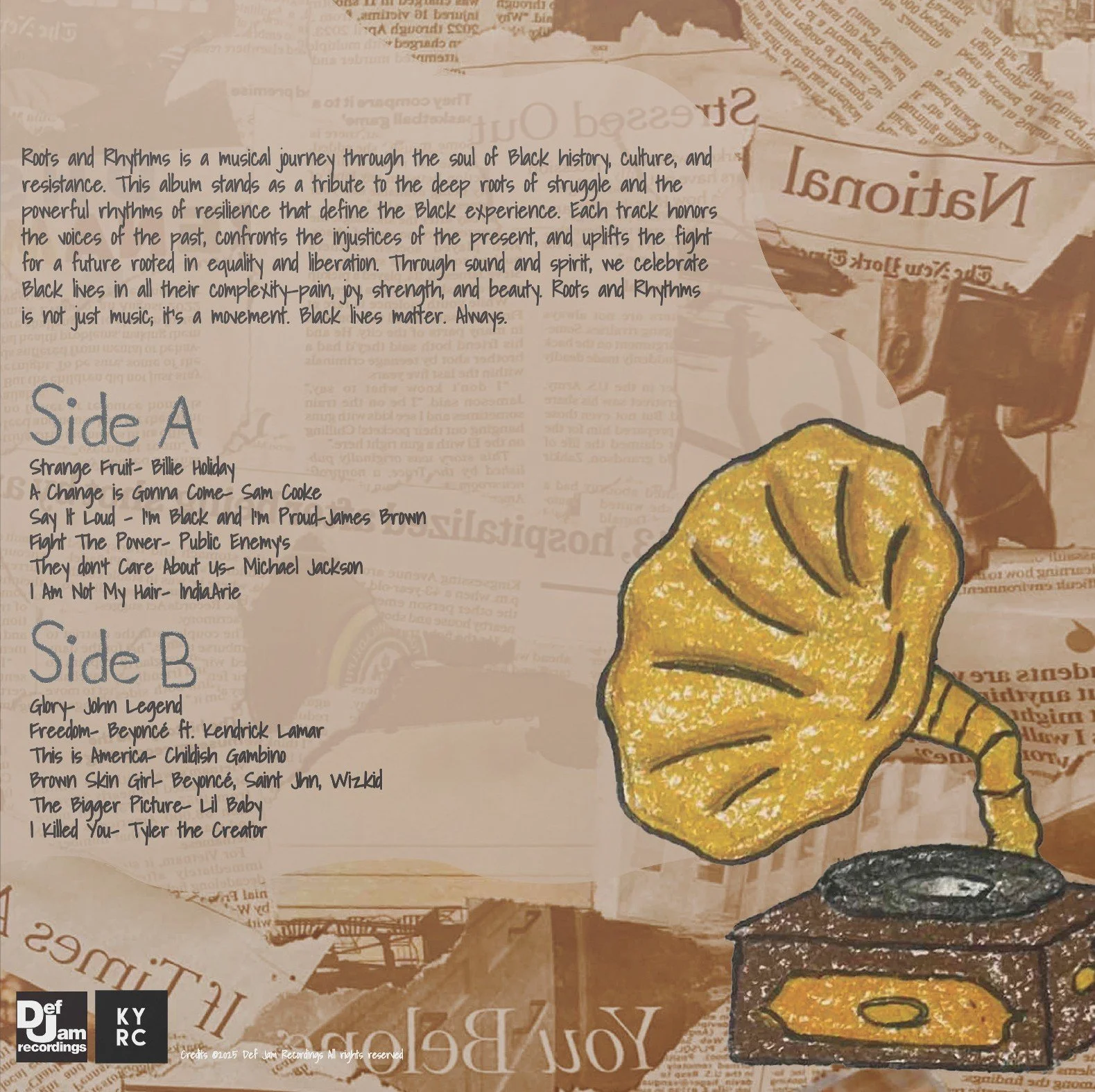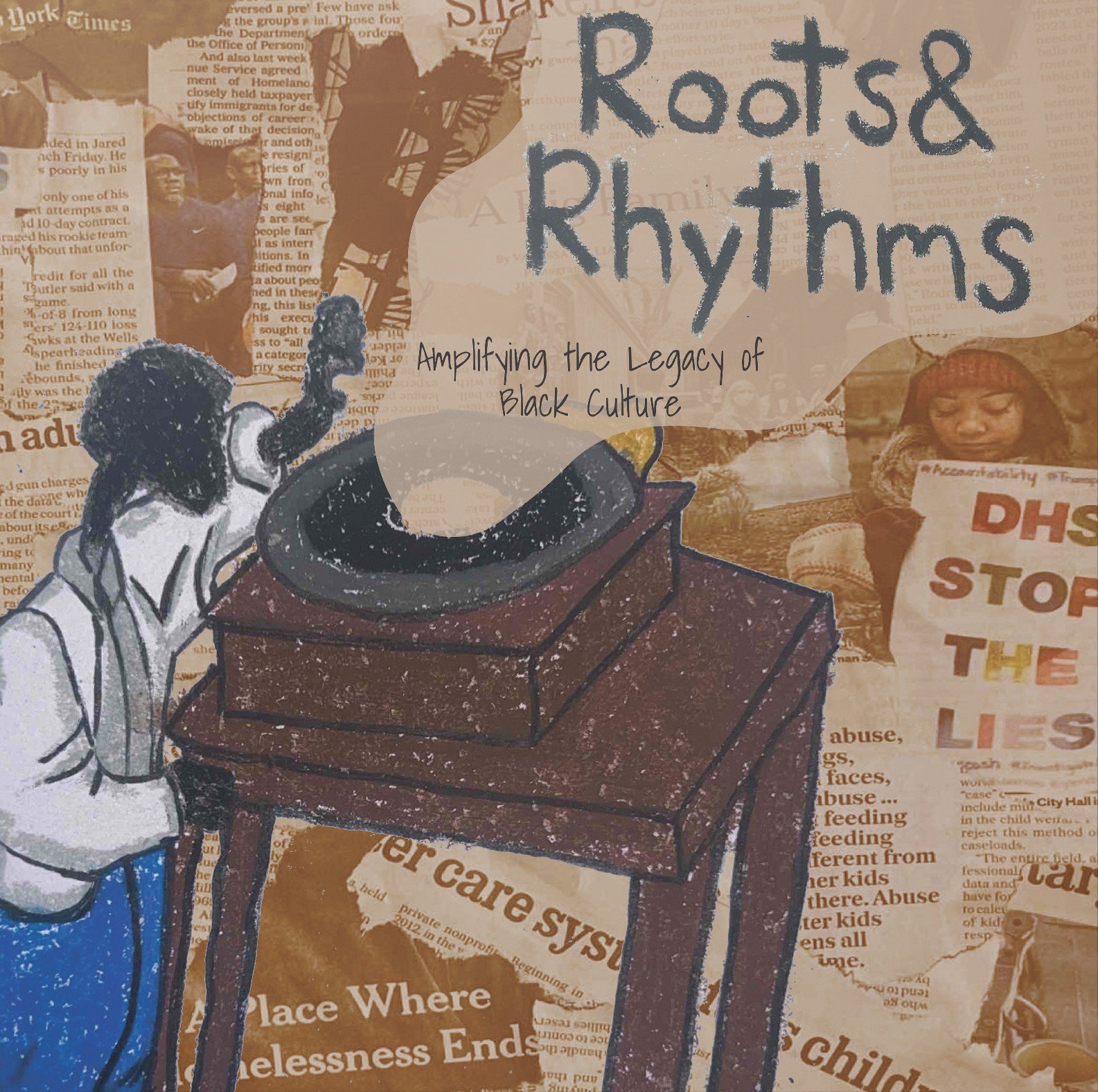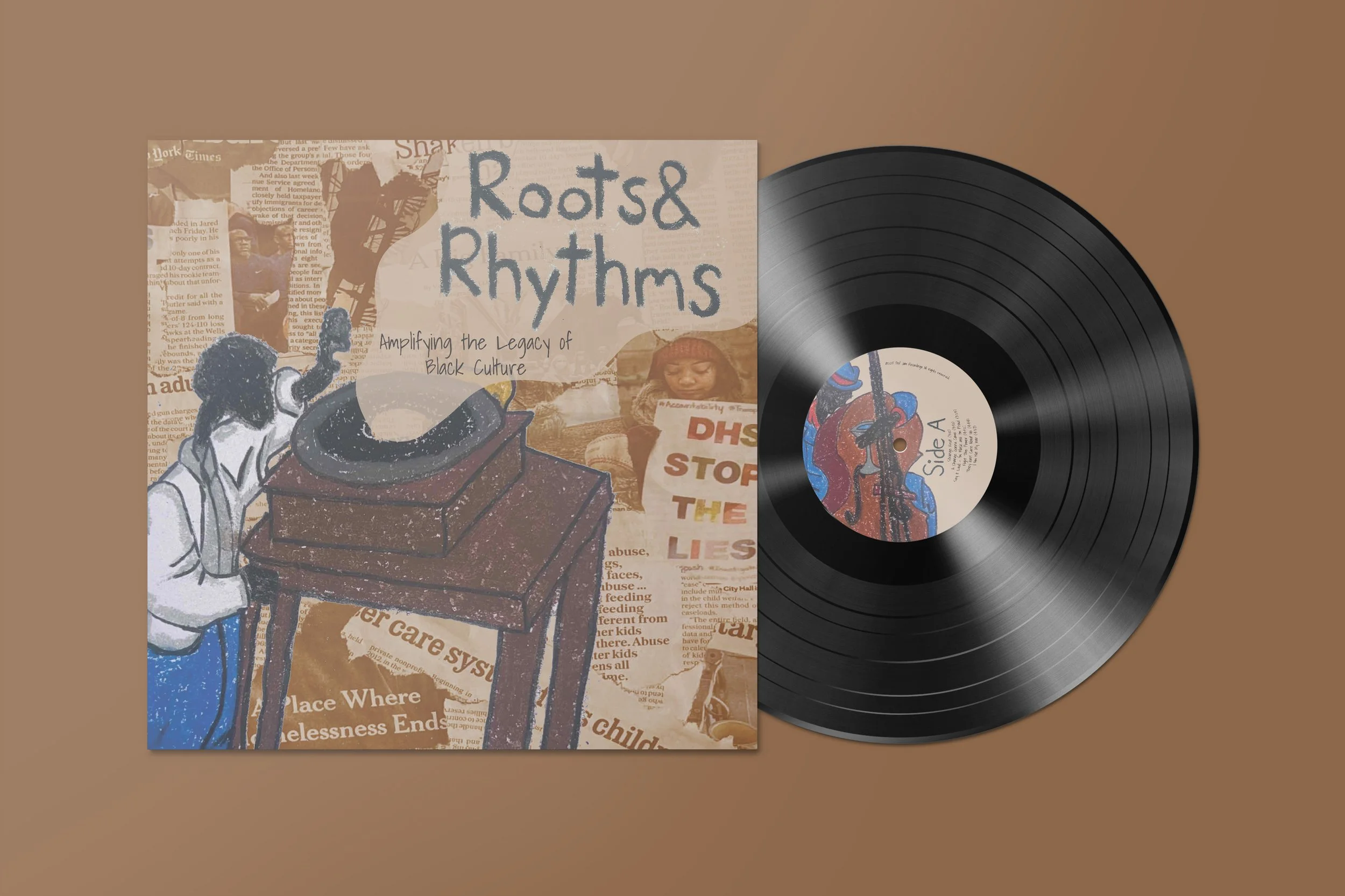 Join Roots & Rhythms as they celebrate black lives in all their complexity, pain, joy, strength, and beauty. Each track honors the voices of the past, confronts the injustices of the present, and uplifts the fight for a future rooted in equality and liberation. The design features newspaper background, hand-drawn lettering, and illustrations that align with the culture of the album. This album is a tribute to the defining black experience of struggle and powerful rhythms.